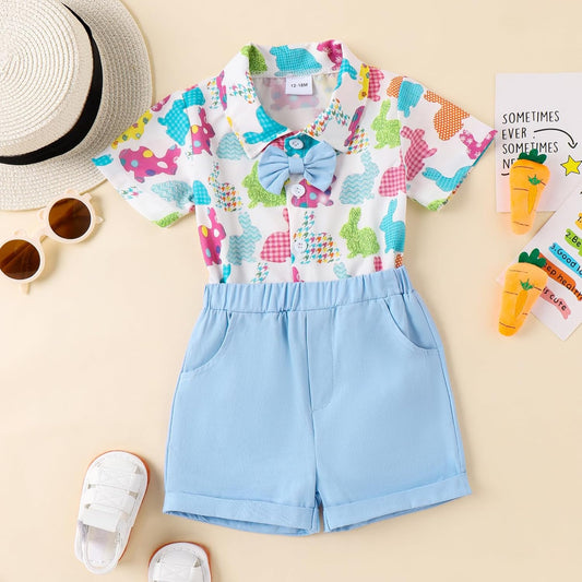 2-teiliges Oster-Outfit für Babys und Kleinkinder, Jungen, kurzärmliges Oberteil mit Knopfleiste und Fliege und einfarbigen Shorts