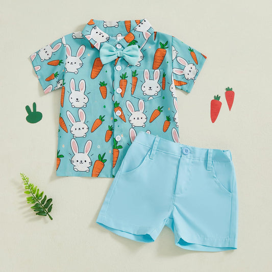 Baby Junge Ostern Outfit Bunny Print Kurzarm Button-up Fliege Hemd Shorts Set Kleinkind Junge Sommer Kleidung