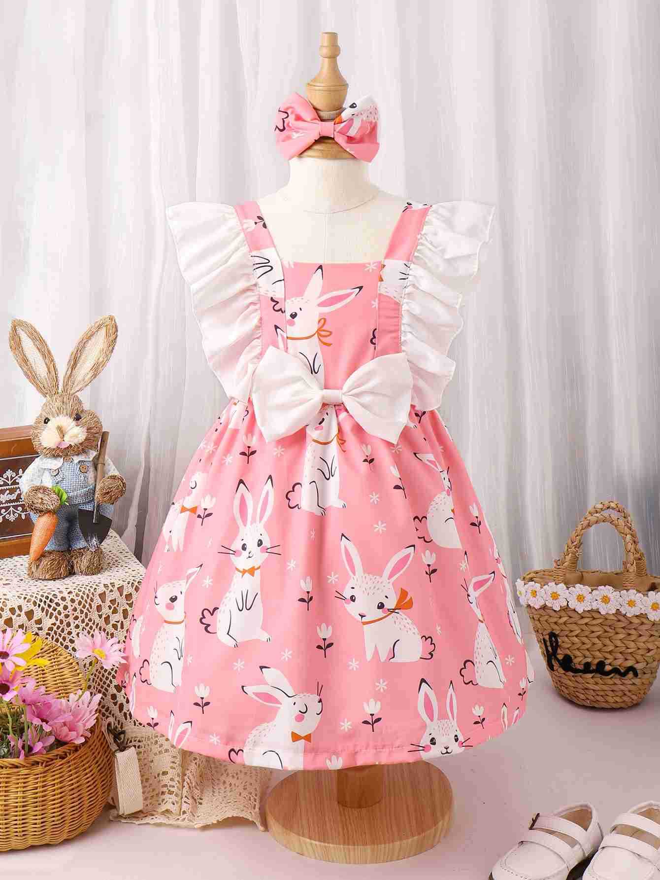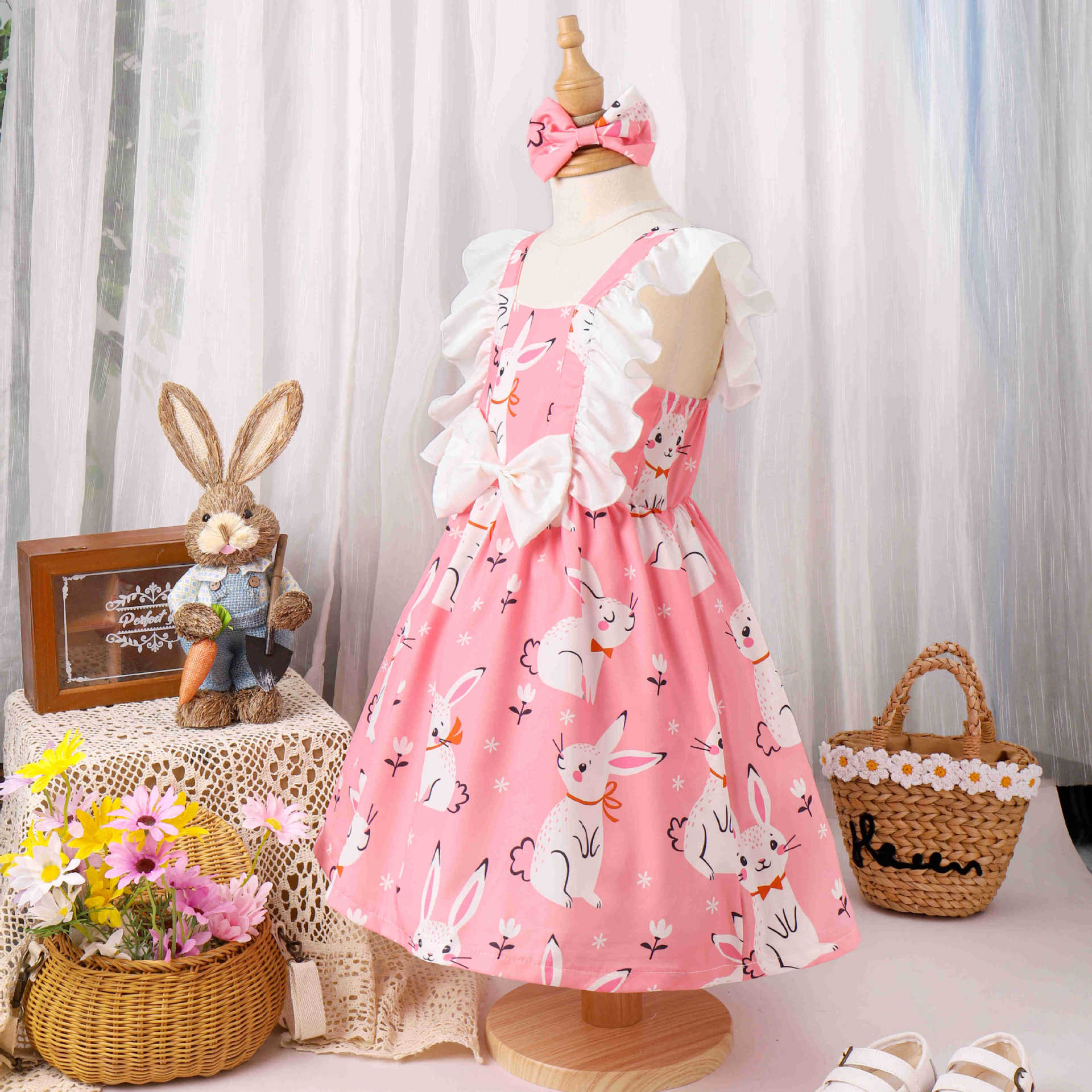 Bezauberndes Osterhasen-Prinzessinnenkleid – Patchwork-Kleid mit Flatterärmeln und Schleifenakzent für Mädchen im Frühling/Sommer.
