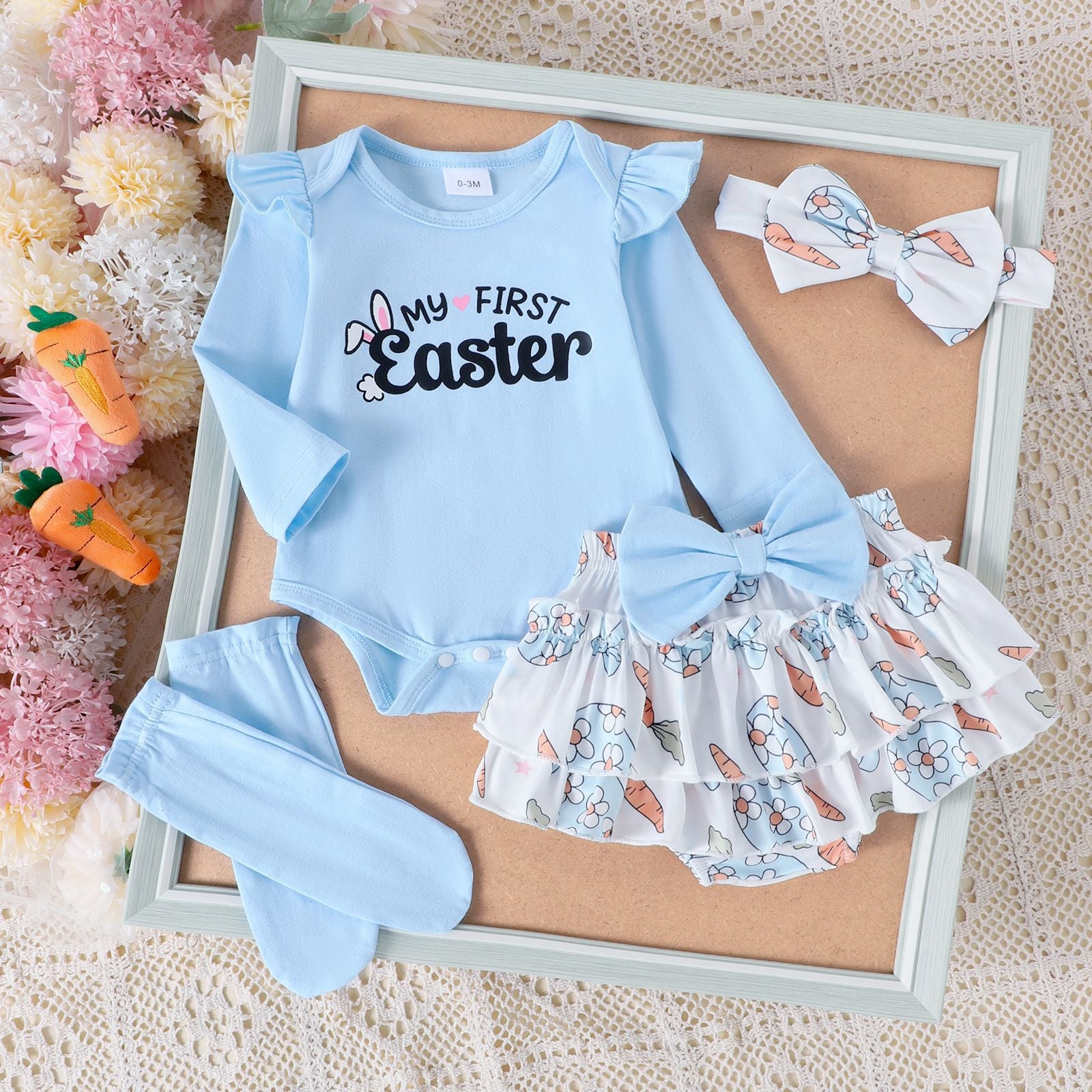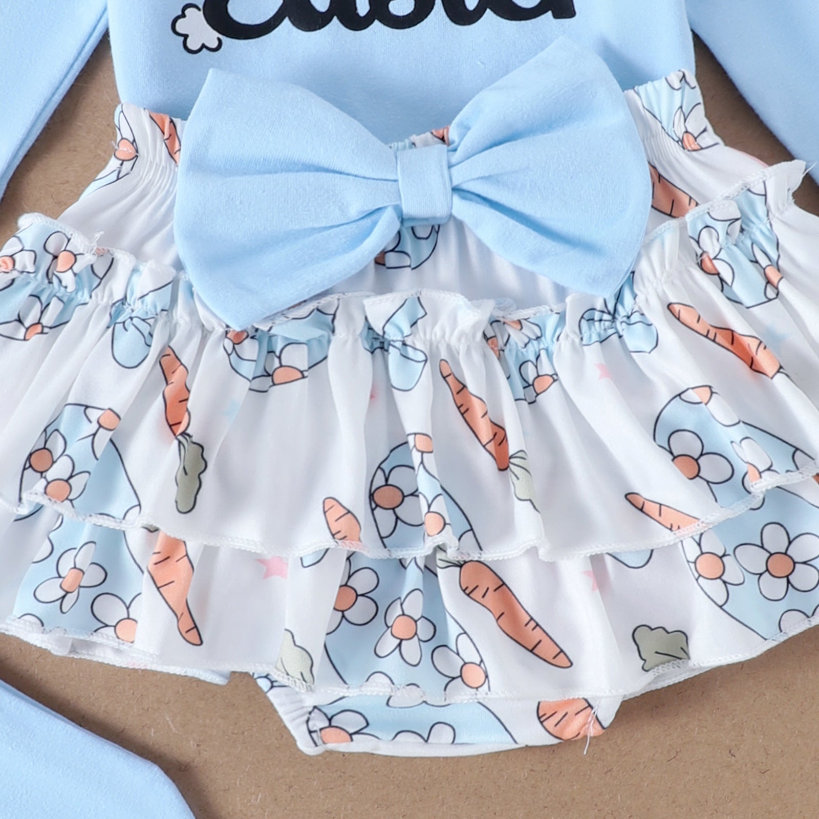 4-teiliges Oster-Outfit-Set für Babymädchen – Hasen-Strampler, Rock mit Schleife, Socken und Stirnband