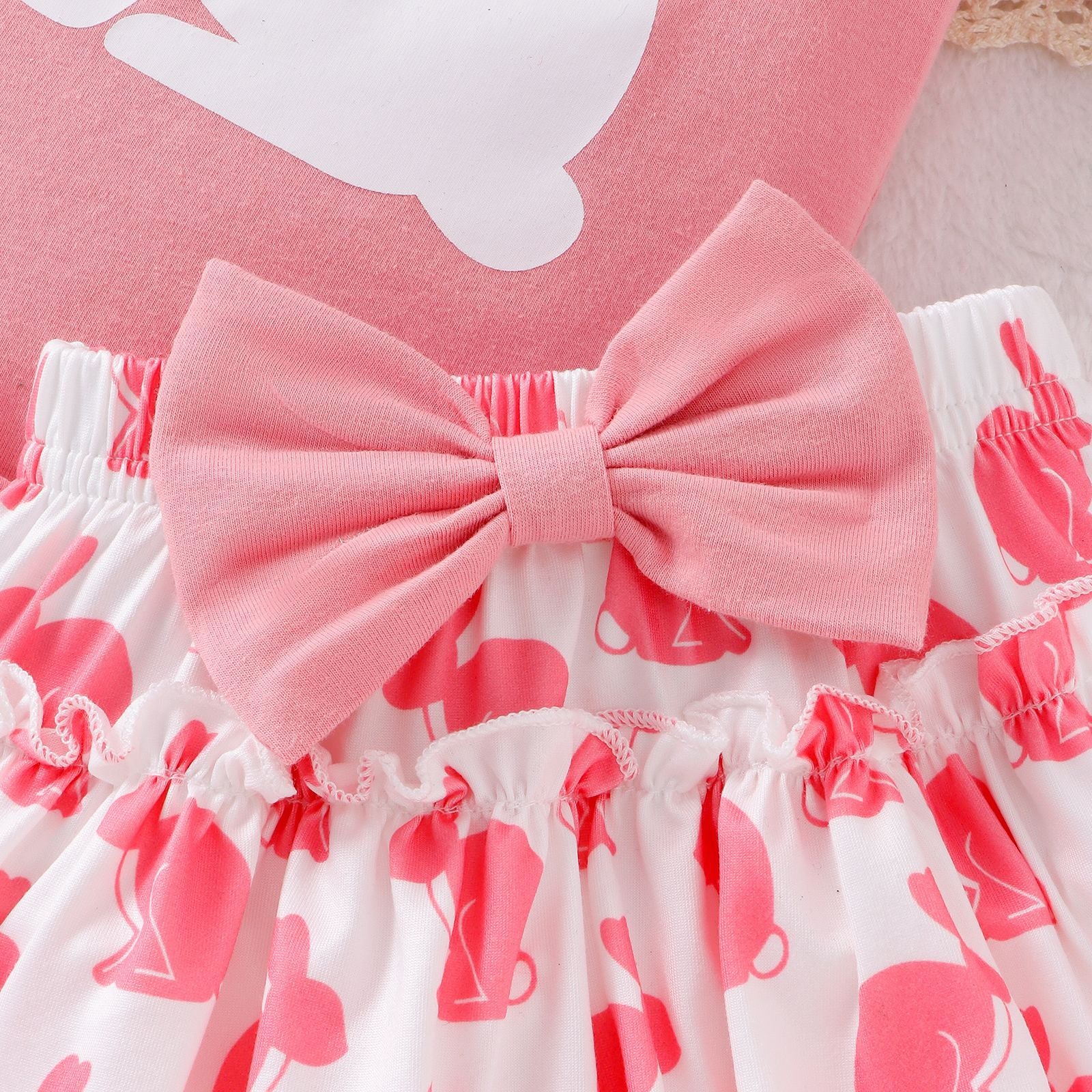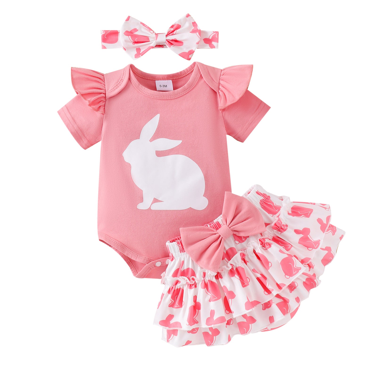 Baby-Mädchen-Set mit rosa Osterhasen-Print – süßer Kurzarm-Strampler mit Schleife und Tüllrock.