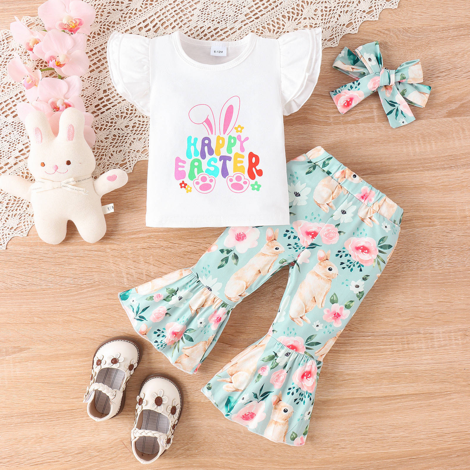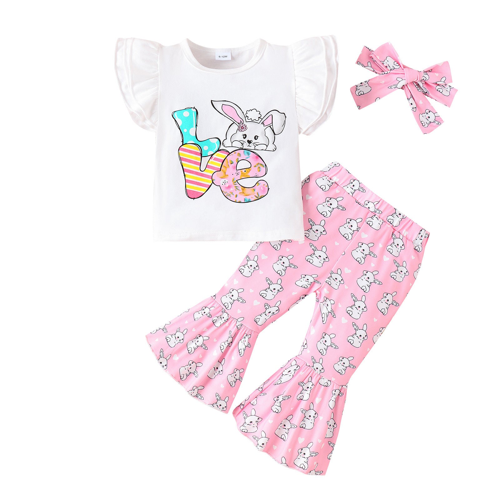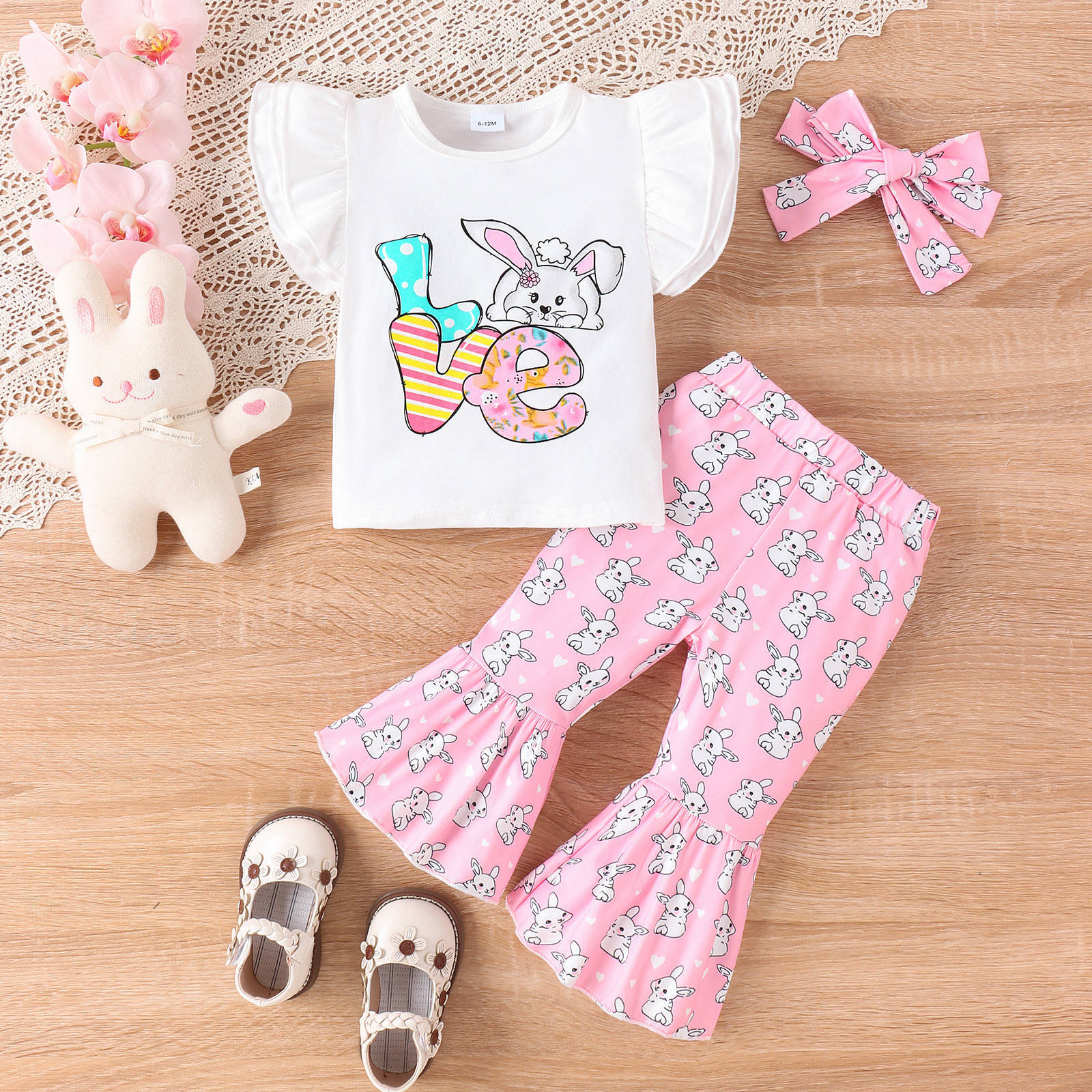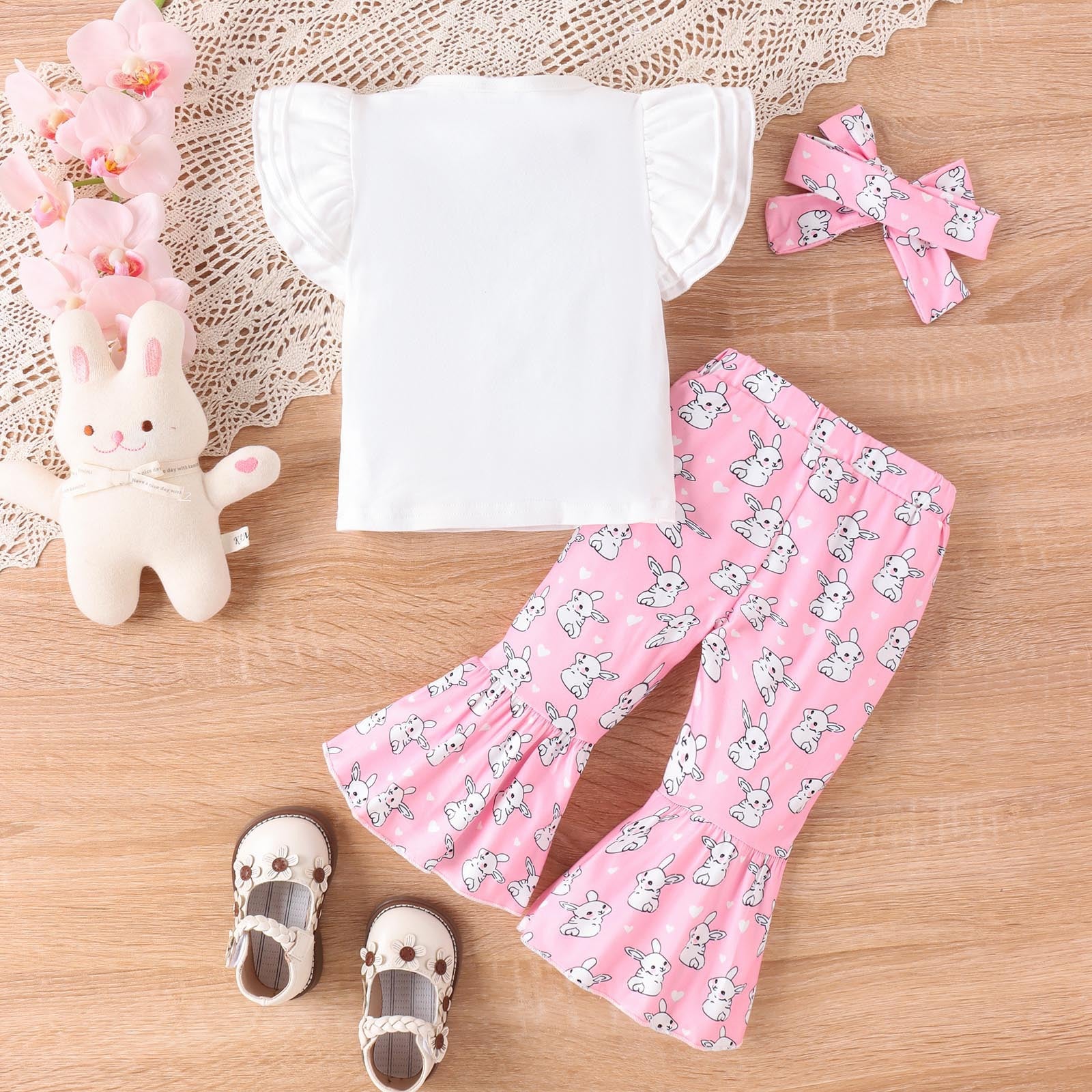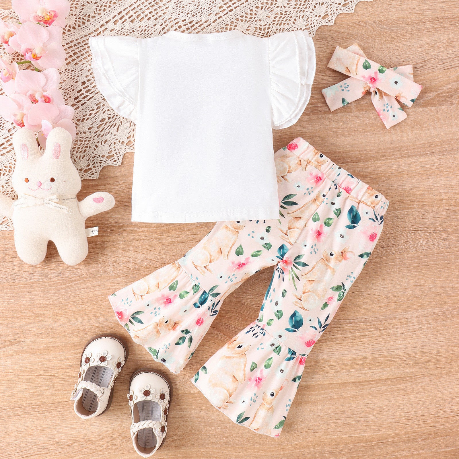 3-teiliges Set für Mädchen – Weißes Flattertop und mehrfarbige Schlaghose mit Häschenmotiv