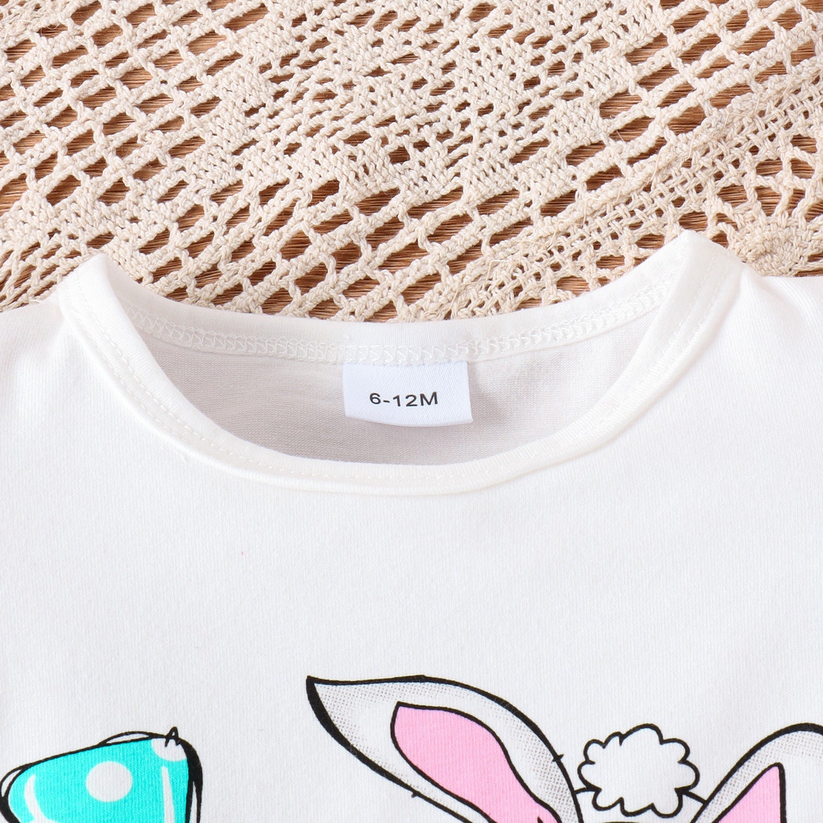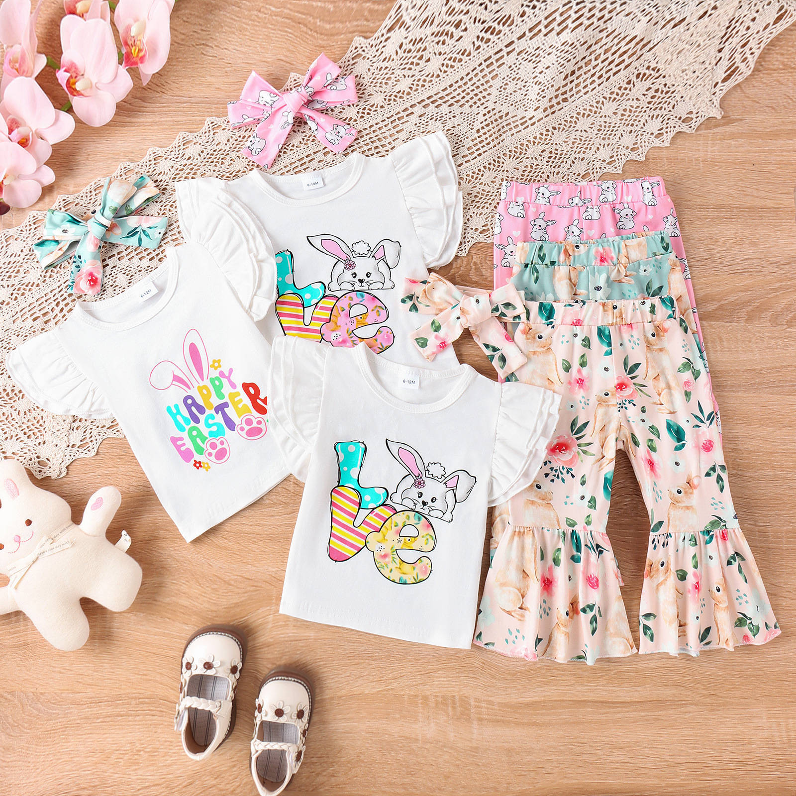 3-teiliges Set für Mädchen – weißes Flattertop und mehrfarbige Schlaghose mit Häschenmotiv.