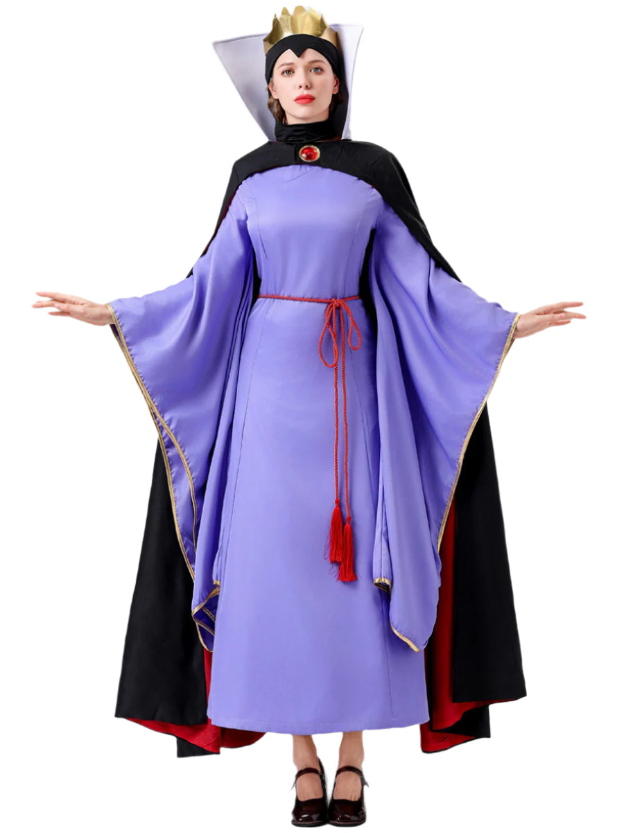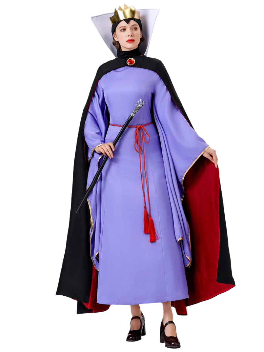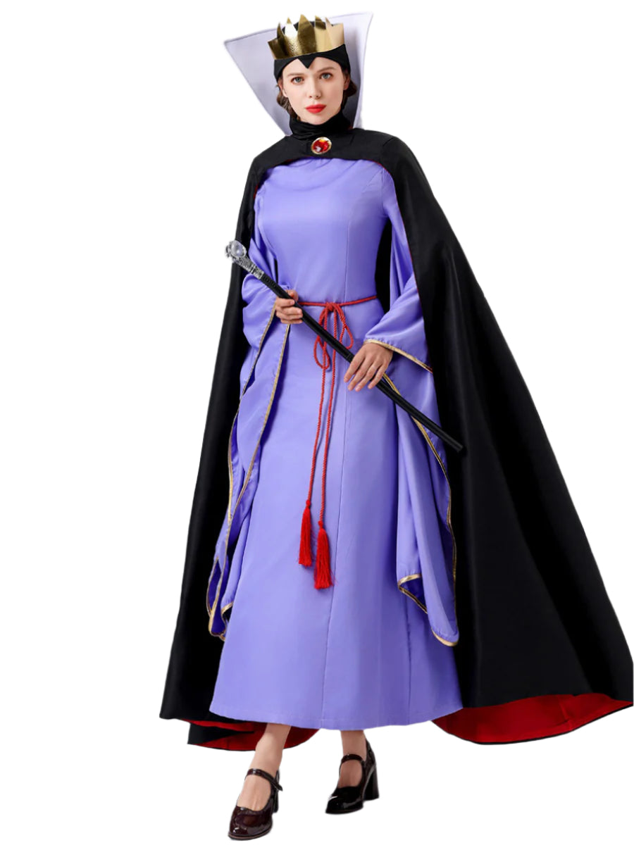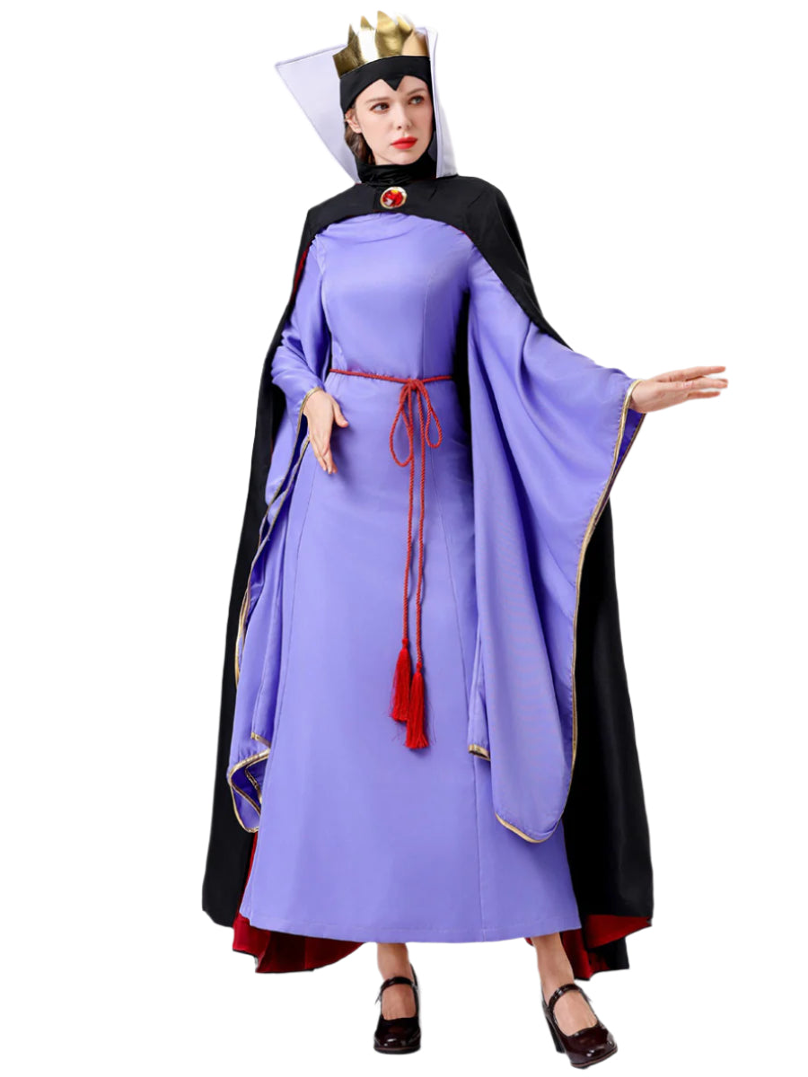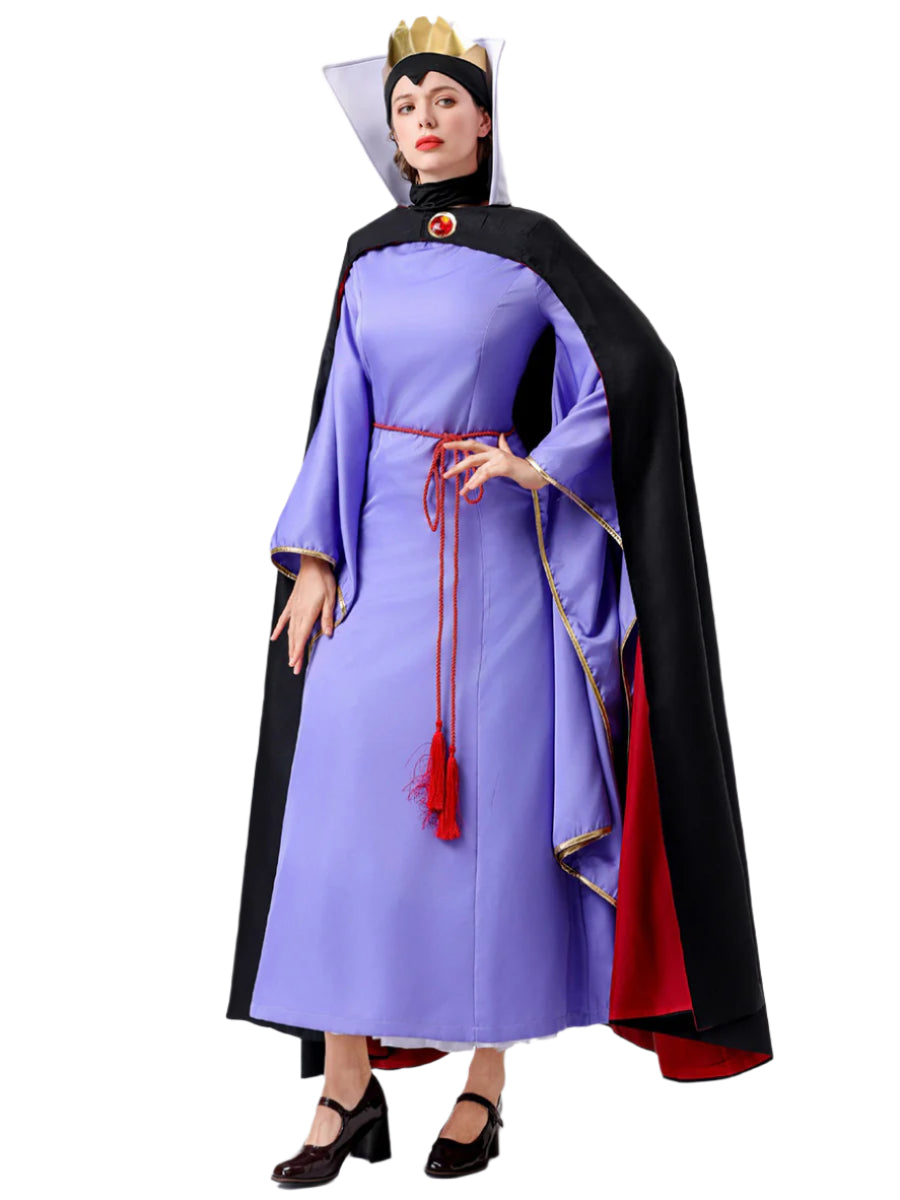 Königin-Kostüm für Damen, lila Kleid mit schwarzem Umhang und Krone, komplettes Set für Mottopartys